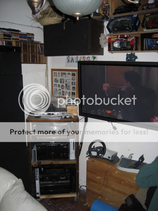 As you can also see I've got the xbox 360 wireless racing wheel, a Pioneer 50" TH-50PHD8UK Plasma, and huge speakers, two mounted on the wall, (onen ot pictured) and two, one on top of the other.