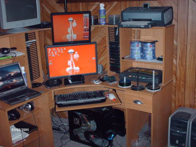 this is a recent pic regardless of what the date says....messy and cluttered..I know. Hey, if a cluttered and messy is the sign of a cluttered and messy mind, then what's an empty desk the sign of? PC case is falling apart....need to fix that. Getting low on blank DVD's....better re-order!!